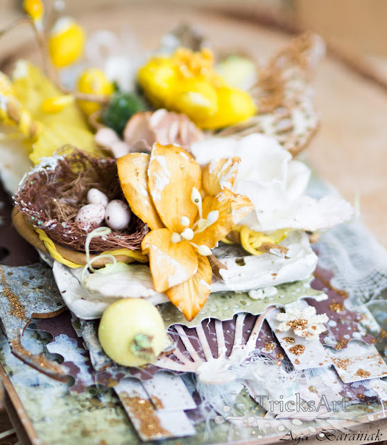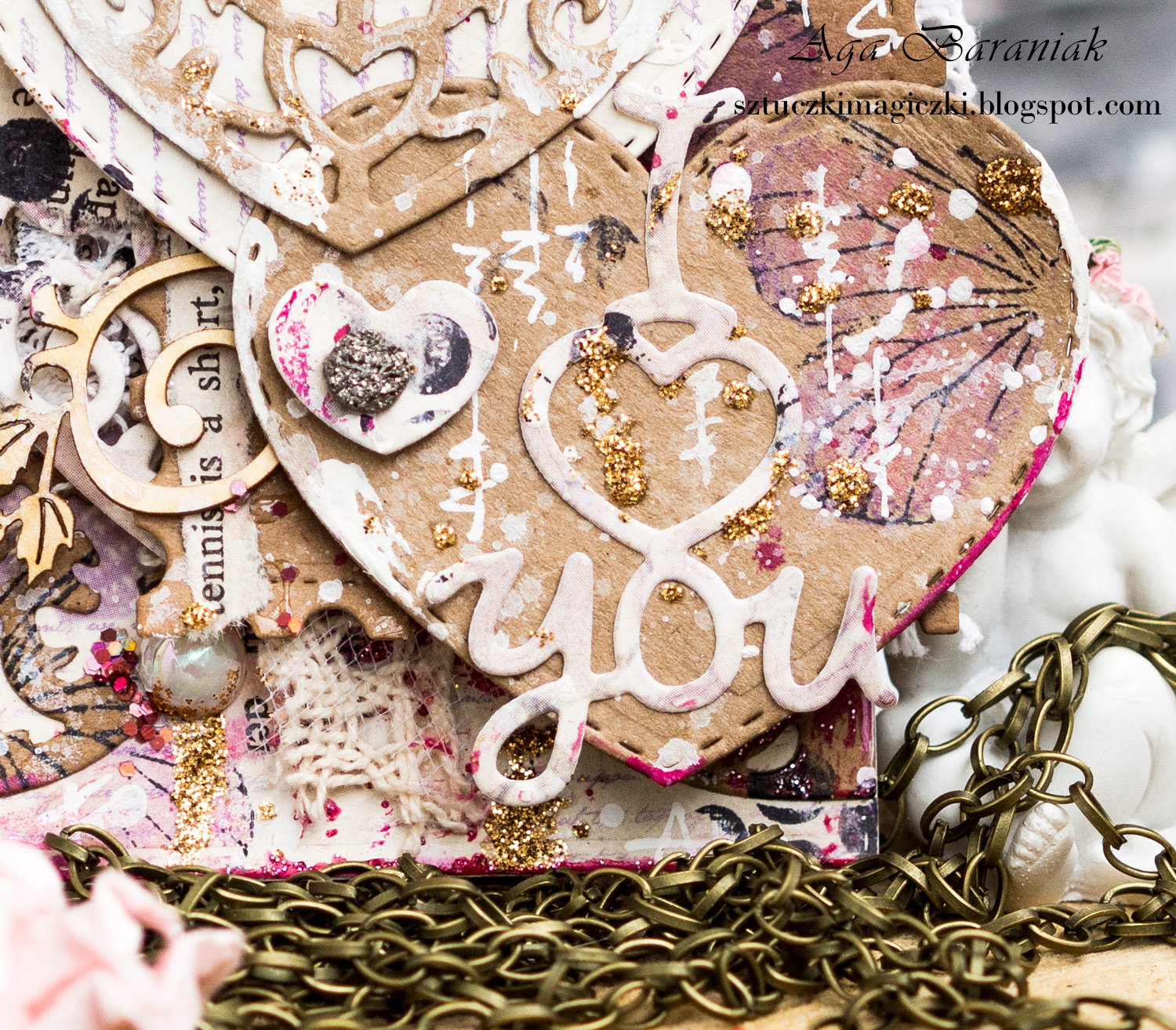 przybrudzone tuszem Distress oraz przyozdobione papierem i tekturkami.