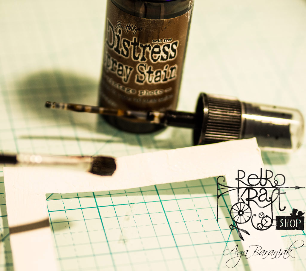 Po wyschnięciu za pomocą pędzla w spękania wprowadzamy mgiełkę Distress o wybranym kolorze.